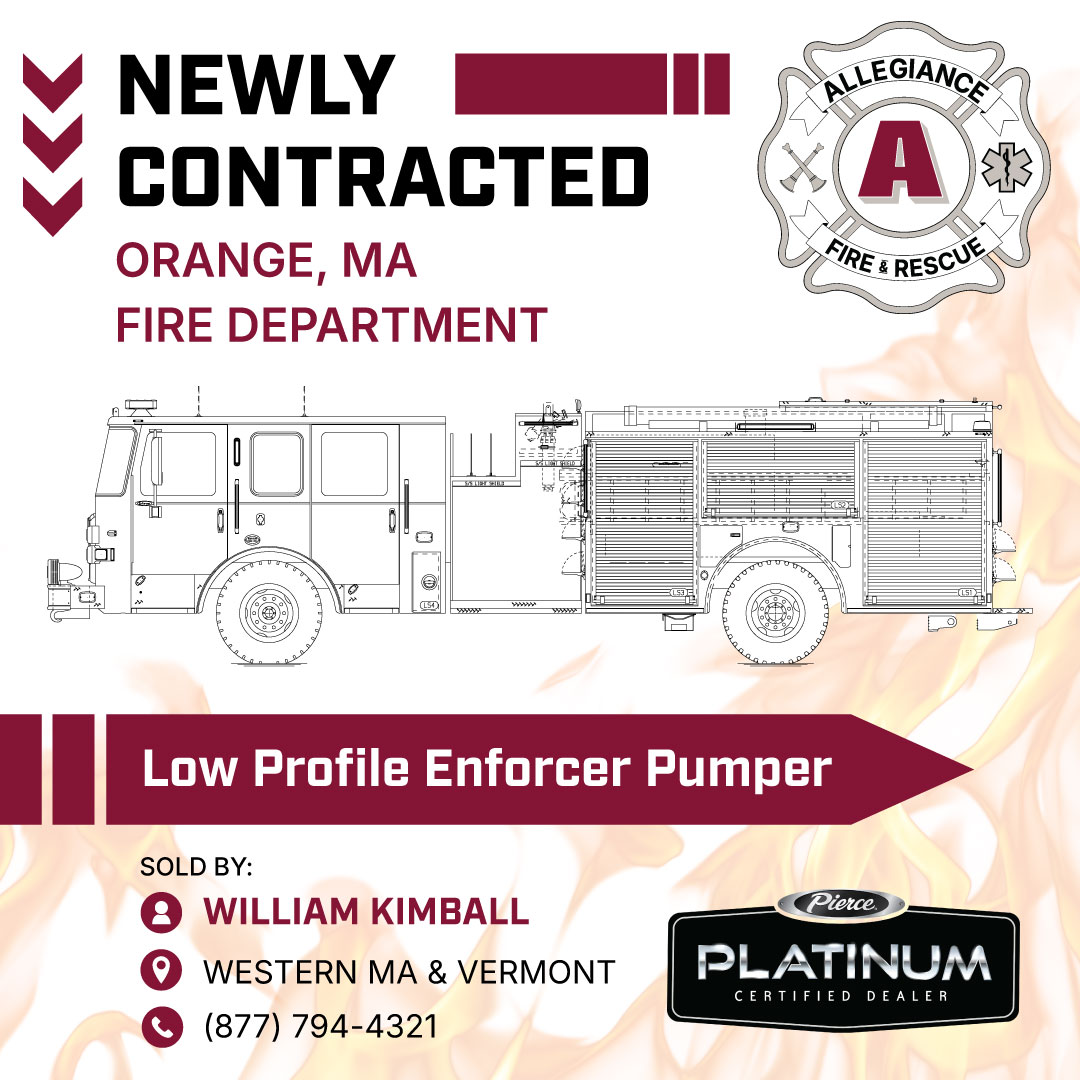 Abington Fire Department has placed an order with Allegiance for a Pierce Saber 1500/750 pumper. September 2024. Acton Fire Department has placed an order with Seagrave for a 100' RM ladder truck. October 2024. Acton town meeting approved funding for a new pumper. May 2025. Adams Fire Department has placed an order with Greenwood Emergency Vehicles for an E-One custom pumper. Dec 2022. Amherst Fire Department has placed an order with Greenwood Emergency Vehicles for a Horton ambulance built on a Ford F-550 chassis. April 2023. Andover Fire Department has placed an order with Greenwood EV for an International MV/Horton ambulance. June 2025. Ashburnham Fire Department has placed an order with Greenwood Emergency Vehicles for a Horton ambulance built on a Ford F-550 chassis. December 2023. Auburn Fire has placed an order with Allegiance Fire/Rescue for two (2) Chevy 5500HD/Road Rescue 4X4 ambulances. Nov 2023. Ayer Fire Department has placed an order with Greenwood EV for a Horton ambulance built on a Ford F-550 chassis. August 2024. Bedford Fire Department has placed an order with Greenwood EV for an E-One custom pumper. June 2024. Berlin Fire Department has placed an order with Greenwood Emergency Vehicles for an ambulance built by Wheeled Coach. Jan 2023. Berlin Fire Department has placed an order with Allegiance Fire/Rescue for a Pierce Saber 1500/1500 pumper. August 2023. Bernardston Fire Department has placed an order with Allegiance for a Pierce Enforcer 1500/2500 pumper-tanker. September 2024. Boston has placed an order with Greenwood Emergency Vehicles for six (6) E-One Cyclone-Metro 100' RMA ladder trucks. Jan 2023. Boston has placed an order with Greenwood Emergency Vehicles for 9 E-One Typhoon pumpers. As with the previous order, E-One will construct 3 pumps per year for a 3 year period. February 2024. Boylston Fire Department has been awarded a Federal grant to purchase a new tanker. August 2024. Bridgewater Fire Department has been awarded a Federal grant to purchase a new brush truck. March 2023. Bridgewater Fire Department has placed an order with Greenwood EV for a Ford F-550/Horton ambulance. January 2025. Brockton Fire Department has placed an order with Allegiance for two (2) Pierce Enforcer 1500/750 pumpers. November 2024. Burlington Fire has placed an order with Allegiance Fire/Rescue for a Pierce Velocity 100' RM Tower. Nov 2023. Burlington Fire Department has place an order with Allegiance for a Pierce Enforcer 1500/500 pumper. July 2025. Cambridge Fire Department has placed an order with Allegiance Fire/Rescue for a Pierce Enforcer 1500/500 pumper. February 2024. Cambridge Fire Department has placed an order with Allegiance Fire/Rescue for a Pierce Enforcer 100' RM ladder truck. February 2024. Cambridge Fire Department has placed an order with Allegiance for two (2) Pierce Enforcer 1500/500 pumpers. November 2024. Canton Fire Department has placed an order with Greenwood EV for a Horton ambulance built on a Ford F-550 chassis. June 2024. Carver Fire Department has placed an order with Allegiance for a Pierce Impel-Ascendant 110' RM Tower with 1500 GPM pump. November 2025. Centerville-Osterville-Marston Mills Fire Department has placed an order with Allegiance for two (2) Pierce Enforcer 2000/750 pumpers. November 2024. Centerville-Osterville-Marston Mills Fire Department has placed an order with Allegiance for a Pierce Enforcer 2000 GPM 107' Ascendant rear mount ladder truck. November 2024. Chelmsford Fire Department has placed an order with Allegiance for a Pierce Enforcer 1500/750 pumper. August 2024. Chelsea Fire Department has placed an order with Allegiance Fire/Rescue for a Pierce Enforcer Ascendant 100' MM Tower w/ rear steer. Jan 2023. Chelsea Fire Department has placed an order with Allegiance for a Pierce Enforcer 1500/750 pumper. December 2024. Clinton Fire Department has placed an order with Greenwood EV for a Horton ambulance built on a Ford F-550 chassis. August 2024. The Danvers Fire Department has placed an order with Allegiance for a Pierce Saber 1500/750 pumper. Delivery is expected in the spring of 2027. October 2025. Darmouth Fire District 1 has placed an order with Allegiance for a Pierce Enforcer 1500/750 pumper. August 2024. Dedham Fire Department has placed an order with Greenwood EV for an E-One 100' RMA ladder truck. July 2024. Dennis Fire Department has placed an order with Greenwood EV for four (4) Ford F-550/Horton ambulances. September 2024. Dennis Fire Department has placed an order with Allegiance for a Pierce Enforcer 110' Ascendant tower. December 2024. East Longmeadow Fire has placed an order with Allegiance Fire/Rescue for a Pierce Enforcer PUC 1500 GPM Pumper with 759 gallon water tank. This will join the 1500 GPM Enforcer PUC ordered in 2022. Additional features include a Cummins 450hp L9 engine, TAK-4 independent front suspension, heavy-duty 13.38” hot-dipped galvanized frame rails, and a Pierce Husky 3 foam system and Hercules CAFS. Everett Fire Department has placed an order with Allegiance for a Pierce Enforcer 1500/500 pumper. June 2025. Fall River Fire Department has placed an order with New England Fire Equipment for a Spartan/Smeal pumper and a Spartan/Smeal 105' TDA. March 2024. Fall River EMS has placed an order with Greenwood EV for a Ford Transit/Wheeled Coach ambulance. August 2024. Falmouth Fire Department has placed an order with Allegiance Fire/Rescue for a Pierce Arrow XT pumper. March 2023. Falmouth Fire Department has placed an order with Allegiance for a Pierce Enforcer 1500 GPM pumper. November 2025. Gardner Fire Department has placed an order with Greenwood EV for an E-One 95' tower. October 2024. Granby Fire Department has placed an order with Allegiance for a Pierce Enforcer 1500/1000 pumper. September 2024. Hadley Fire Department has place an order with Allegiance for a Pierce Enforcer 1500 GPM/105' RM ladder truck. July 2025. Hamilton Fire Department has placed an order with Allegiance Fire/Rescue for