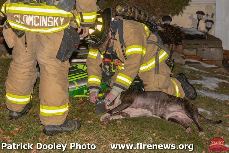| East Hartford, CT firefighters attend to a dog injured in a house fire on January 8th. |