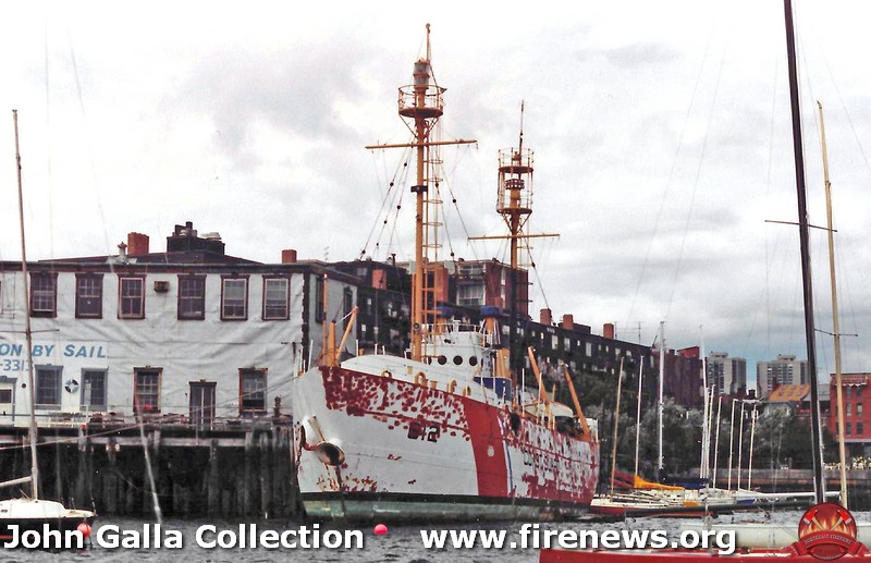 | Decommissioned Lightship Nantucket (612) in Boston in July of 1987 prior to being sold to a private party. |