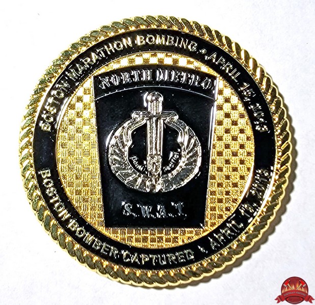 | North Metro SWAT 2013 Boston Marathon manhunt challenge coin. |