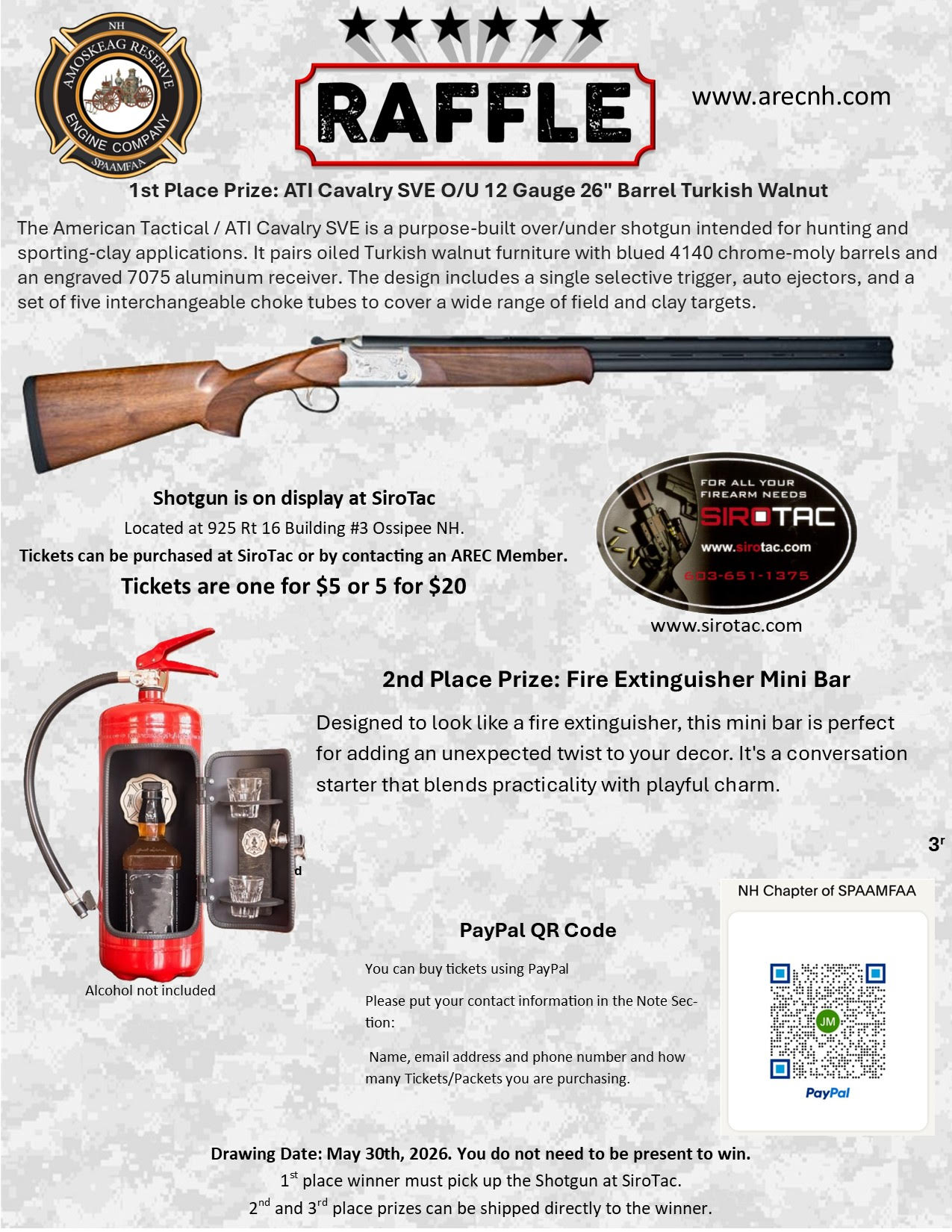 PRESS RELEASES AND OTHER ARTICLES OF INTERESTMAINE More volunteer firefighters in Walkes resign after chief refuses to quit; town opens independent investigation. CLICK FOR ARTICLE MASSACHUSETTS Southborough, Westborough Fire Departments will explore becoming one. CLICK FOR ARTICLE NEW HAMPSHIRE Amoskeag Reserve Engine Company Annual Fundraiser 1st Place Prize: ATI Cavalry SVE O/U 12 Gauge 26″ Barrel Turkish Walnut 2nd Place prize: Fire Extinguisher Mini Bar 3rd Place Prize: Fire Blanket,2 Pack, Fire Blankets Emergency for Home and Kitchen. Drawing Date: May 30th, 2026. You do not need to be present to win. |